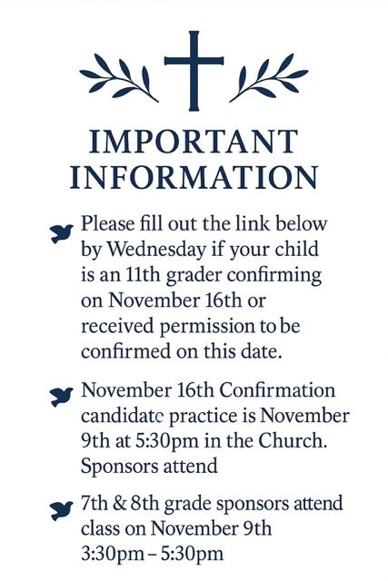 As we are approaching the November confirmation mass, please see all important information and instructions below. November 16th candidates will need to ensure the form below is filled out as soon as possible.